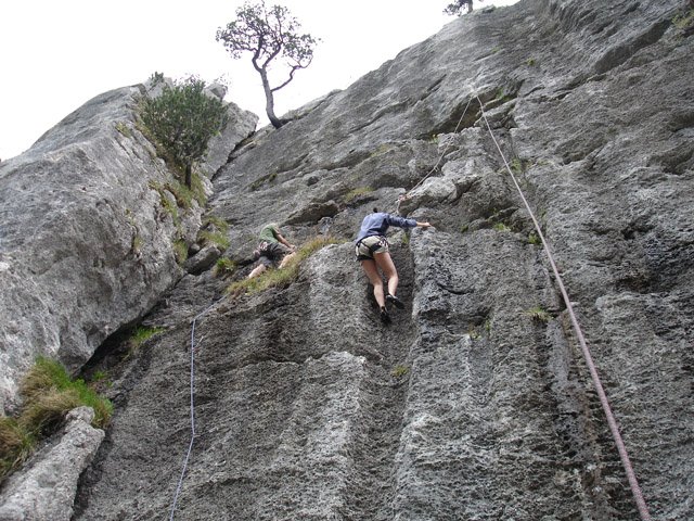 Fab dans Picothérapie (6a) |  pause déjeuner, histoire de reprendre des forces ! |  Jez dans Jardin extraordinaire (6a+) et Céline dans Picocantrope (5b) |