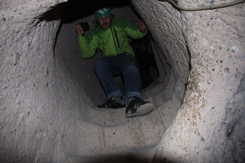 Du coup à 11h nous sommes partis pour Derinkuyu, histoire de faire un peu de tourisme, et nous avons visité les cités souterraines de Kaymakli (entrée à 15TL quand même ...). "Aux VIème et VIIème siècle, lorsque les armées perses et arabes partaient combattre les chrétiens, on allumait des signaux lumineux et le message d'alerte voyageait alors de Jérusalem à Constantinople en quelques heures. Lorsqu'il atteignait la Cappadoce, les chrétiens byzantins se réfugiaient dans des tunnels secrets qui conduisaient à de vastes cités souterraines" (extrait du Lonely Planet).