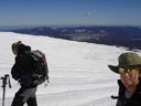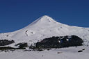 notes: l'avantage des voyages c'est qu'on fait souvent des rencontres ... Nous avons rencontré Sam et Fred (deux anglais de Londres) il y a 4 jours à l'Antuco (eux venaient de le terminer, nous devions le faire le lendemain). Et par le plus grand des hasards, nous nous sommes retrouvés à la Suizandina ! Nous avons décidé de faire une sortie ensemble et pas n'importe laquelle : le Llaima et ses 2100m de dénivelée ! Malheureusement Fred n'a pas eu le courage de se lever, nous sommes donc partis à 3 dans le pickup rouge, Sam l'anglais au volant, conduite à gauche ... Au bout d'une petite heure de piste, nous sommes enfin au pied de ce volcan, qui est tout bonnement ... magnifique ! De la fumée s'échappe de son sommet, les araucarias posés à ses pieds ne sont qu'une invitation à skier ce volcan. Le début se passe sur de la neige de printemps bien regelée durant la nuit, mais vers 2200m, les premières congères apparaissent, la neige est glacée et le soleil omniprésent la transforme presque en mirroir. J'insiste en couteaux alors que Sam et Lilian mettent déjà les crampons. Je me retrouve marcheur comme eux vers 2500m, au pied de l'arête : c'est parti pour 600m de crampons ! La montée est très ambiance entre le vent qui souffle fort, la glace bleue croisée ci et là et les parcelles de pierres volcaniques fumantes ! Victime de crampes, Lilian abandonne 350m sous le sommet. Nous nous retrouvons Sam et moi pour les derniers mètres sous un vent de plus en plus fort. A 14h10, après 6h de montée, nous atteignons enfin le sommet ! Une épaisse fumée s'échappe du volcan. Nous sommes donc obligés d'attendre quelques trouées dans cette fumée pour pouvoir apercevoir le Villarica au loin. 15 min après avoir atteint le sommet, nous descendons, d'abord en crampons puis 500m plus bas en ski sur une neige qui ressemble à de la glace. Après 400m de descente en équilibre précaire, nous trouvons enfin de la bonne neige de printemps pour les 1200m restant qui s'avère être un pur régal ! Ce n'est que vers 16h que nous arrivons enfin à la voiture. Mais la journée n'est malheureusement pas encore finie : la neige du matin étant devenue soupe, nous embourbons le pickup ! et ce n'est qu'au bout d'1h de coups de pelles et de coups de crick que nous nous en sortons ...