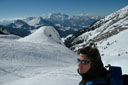 conditions: air frais, ciel bleu et grand soleil (limite trop) : une météo parfaite. Par contre la neige n'est pas excellente. Sur le haut la neige est toute soufflée : 5cm de croûtée au dessus de 30cm de poudreuse. Sur le bas, la croûte est moins importante, mais la neige est plutôt lourde
