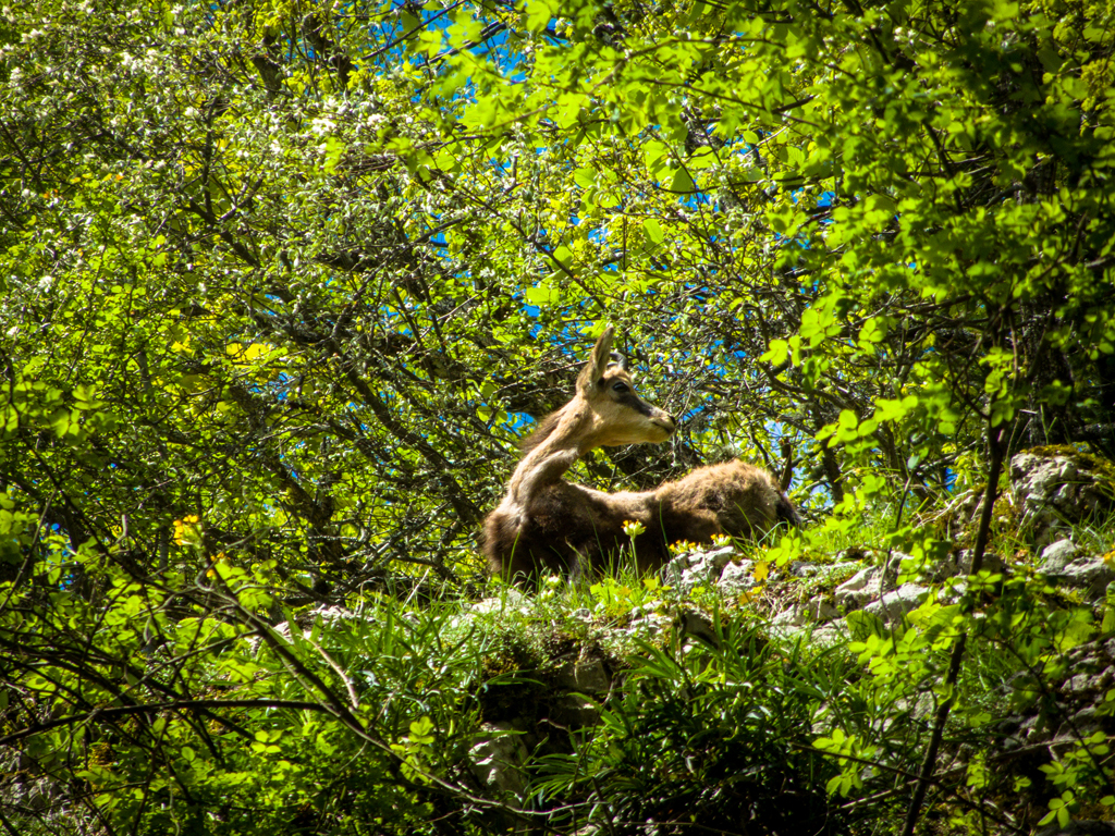 Direction donc la montée au Veyrier par le sentier du Petit Port puis direction le Talabar. Il fait beau, la vue y est toujours aussi belle. Traversée ensuite au dessus de Chavoire et de la Combe pour rejoindre le Chapeau de Napoléon puis le col des Contrebandiers. Malgré la pluie des précédents jours, les chemins sont bien boueux mais on s'attendait à pire. Arrivés sous le col des Contrebandiers, on se prépare, finie la quasi solitude. Et là surprise, nous croisons du monde, mais pas celui que nous attendions. En effet en montant à l'ancienne gare du téléphérique, 2 chamois broutent tranquillement au dessus de nos têtes.